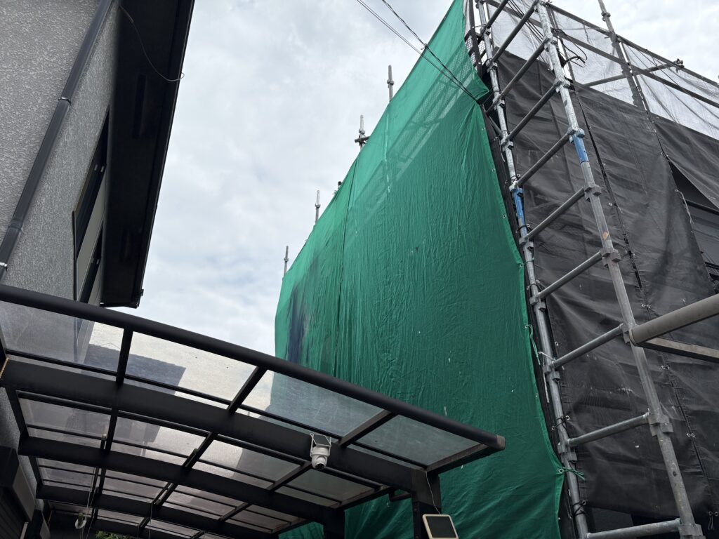 ※近隣住宅への塗料飛散も考慮し、足場施工業者さんが張ったシートの上からもう一枚シートを重ねて張るようにしています。