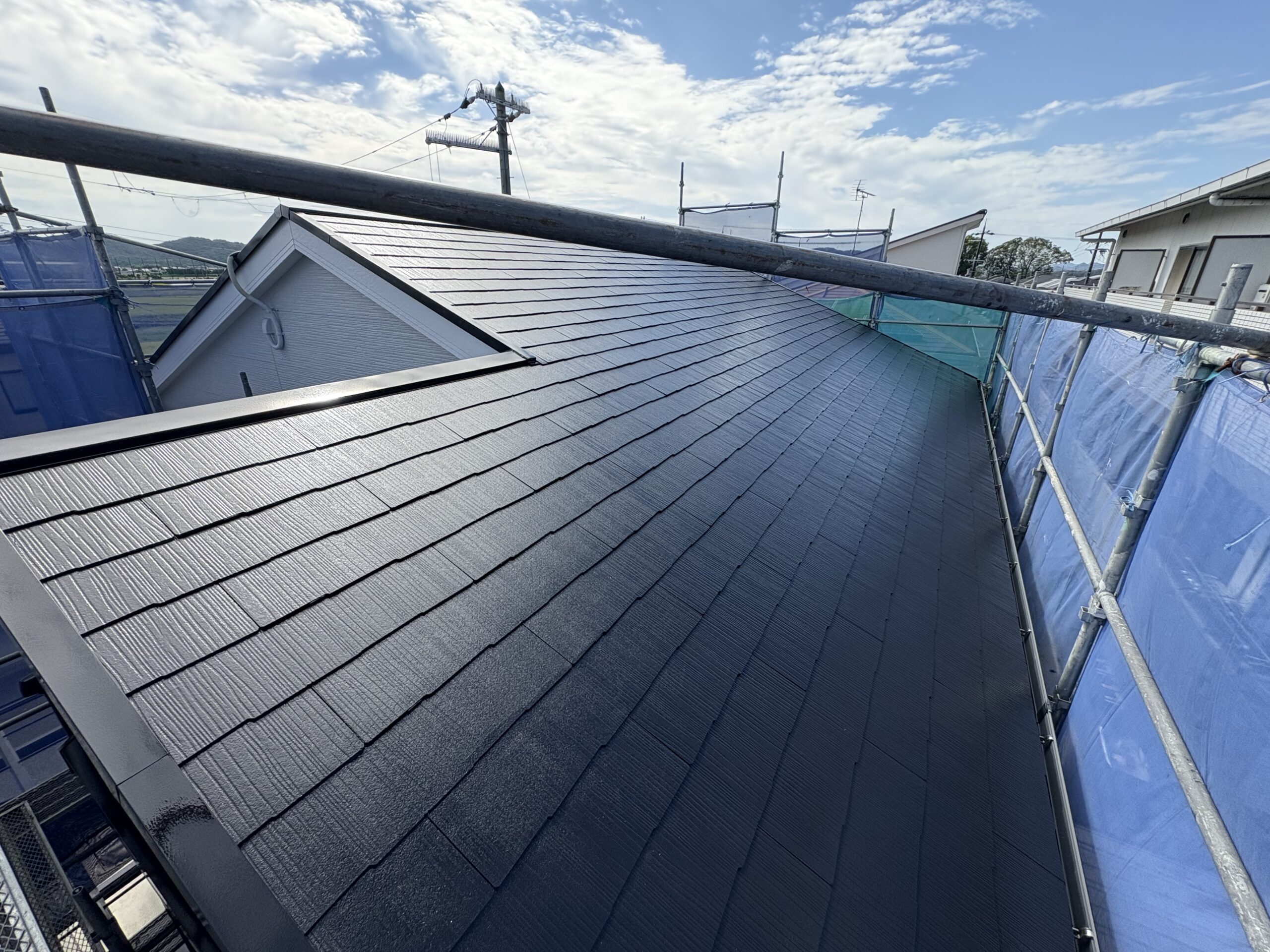 三木市H様屋根塗装工事 2025年10月16日 屋根塗装 上塗り施工後 屋根塗装は7年保証です! 塗装前にしっかりと高圧洗浄させていただき、4回塗り施工にて作業させていただきました。 この度は塗装工事で弊社を選んでいただきありがとうございます。